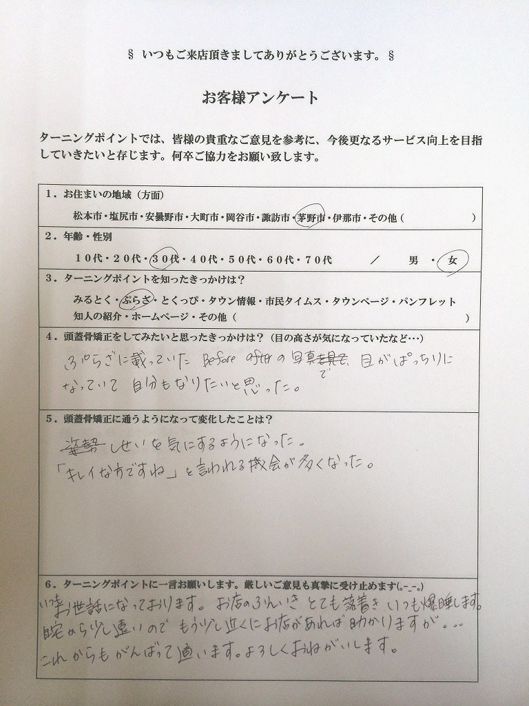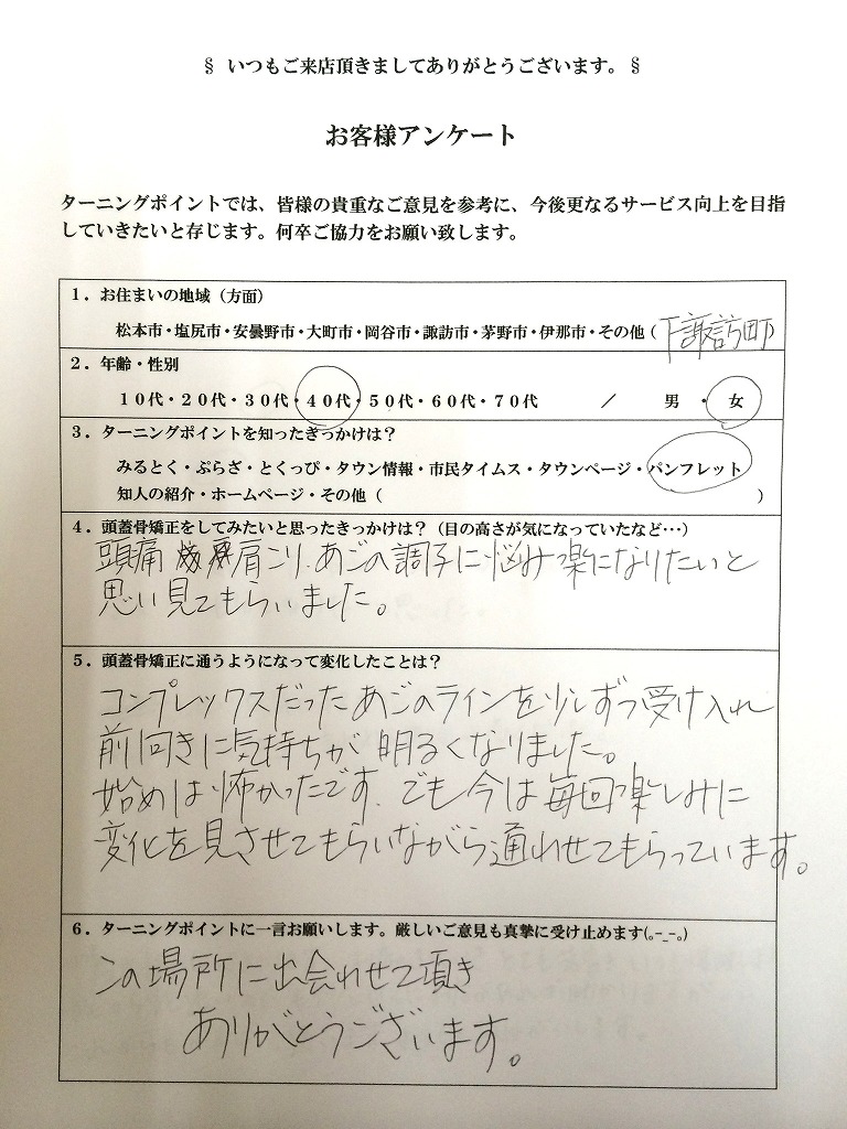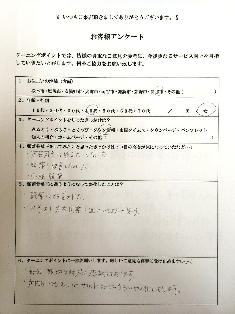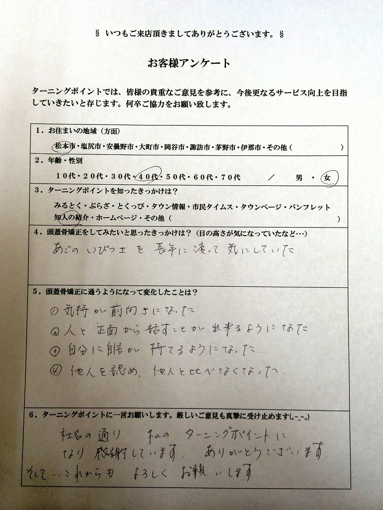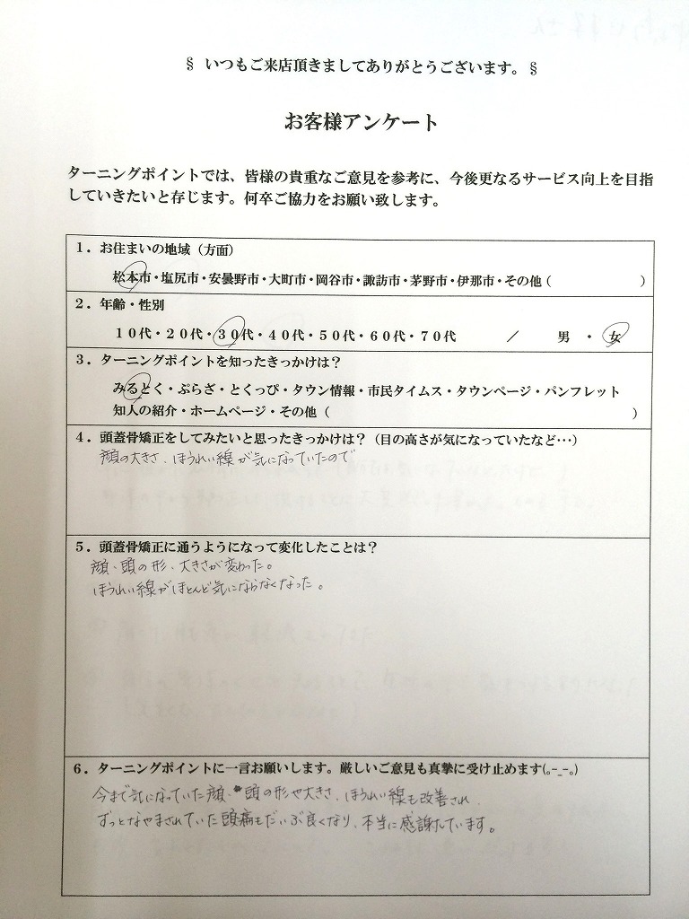 - 今まで気になっていた顔、頭の形や大きさ、ほうれい線も改善されずっと悩まされていた頭痛もだいぶ良くないr本当に感謝しています。